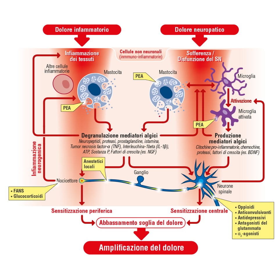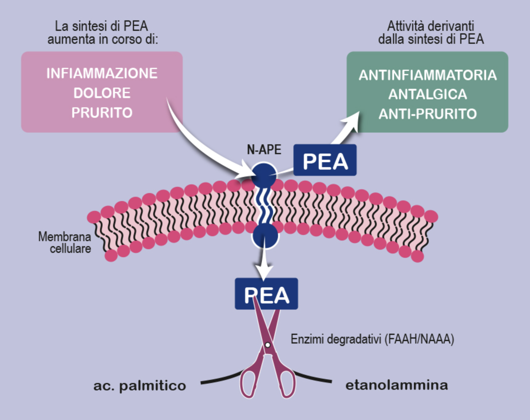 Come ormai più volte confermato in diversi sistemi cellulari, la PEA, naturale, quindi non solo introdotta dall’esterno, viene sintetizzata e rilasciata in seguito a danni attuali o potenziali. Lo si è dimostrato nei leucociti e nei macrofagi stimolati, nelle cellule epidermiche di topo in seguito a vari tipi di stress, nella cute infiammata o interessata da dolore neuropatico, in neuroni corticali come risposta all’aumento sperimentale della concentrazione intracellulare di calcio e, molto recentemente, nella corteccia cerebrale di topo sottoposta ad ischemia focale.