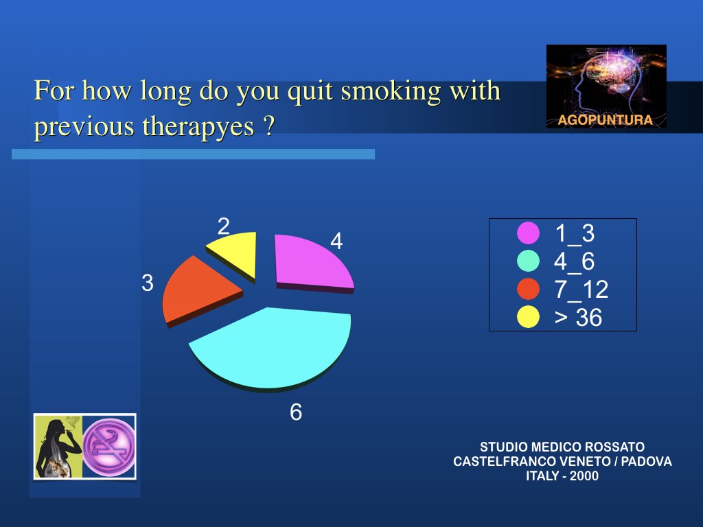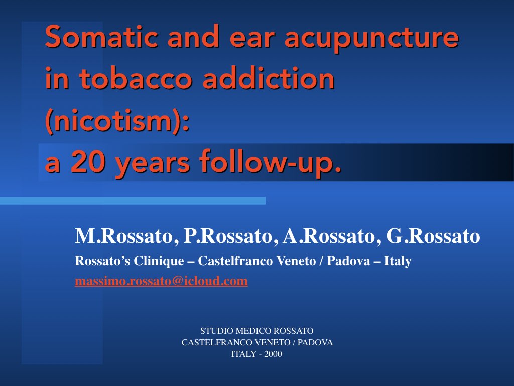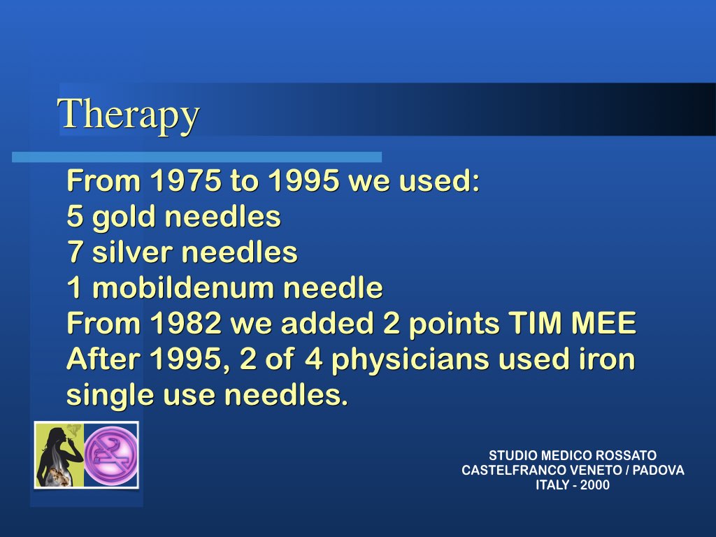 COME:il metodo Rossato è l’agopuntura associata a stimolazione elettrica, farmaci omeotossicologici ed aiuti per la astinenza, dura 20 minuti