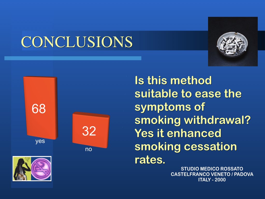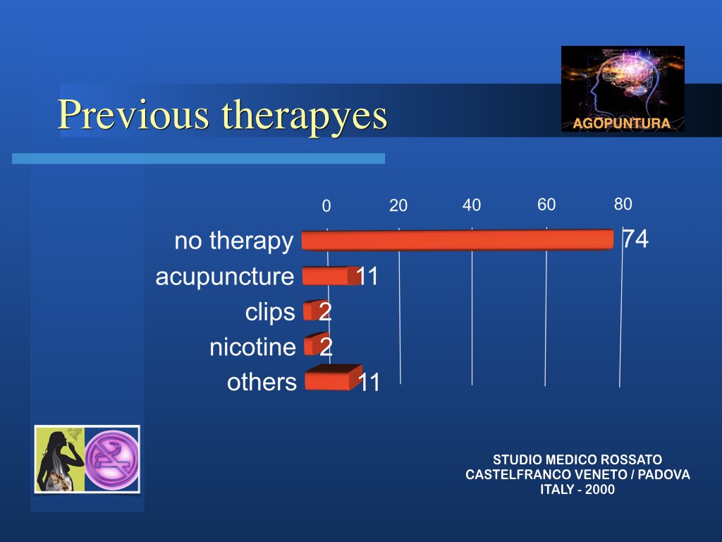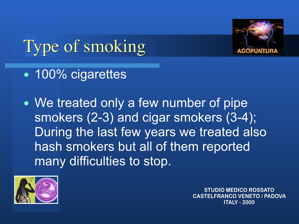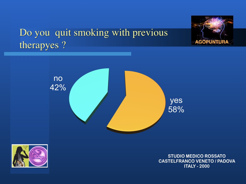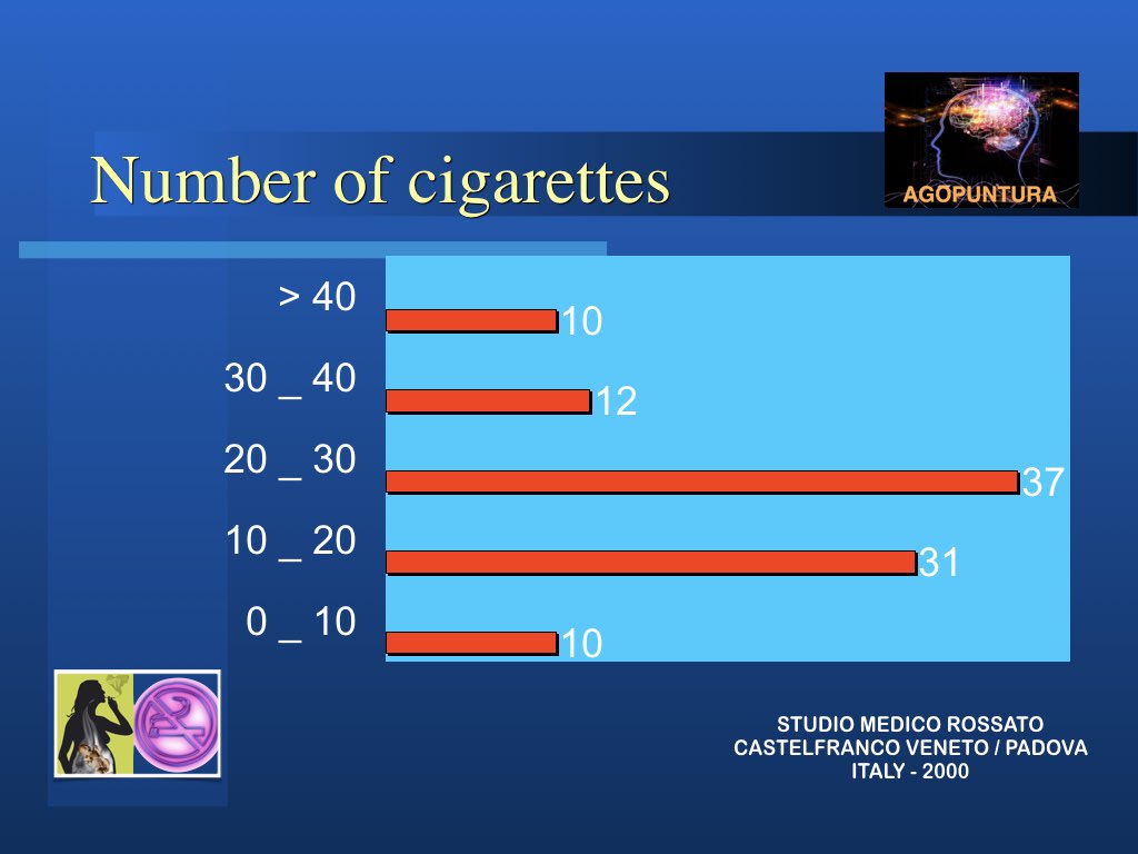 In realtà l’aspetto principale nella modalità di approccio al problema tabagismo per una possibile soluzione è che non si sta trattando di una intossicazione ma di persone intossicate e quindi solo curando la persona si possono trovare le corrette soluzioni. Molto spesso anche le persone di forte volontà, difficilmente riescono a liberarsi da sole del vizio: abbiamo visto invece che anche chi non è convinto di farcela e chiede aiuto impegnandosi, riesce spesso a risolvere il suo problema con l’agopuntura.