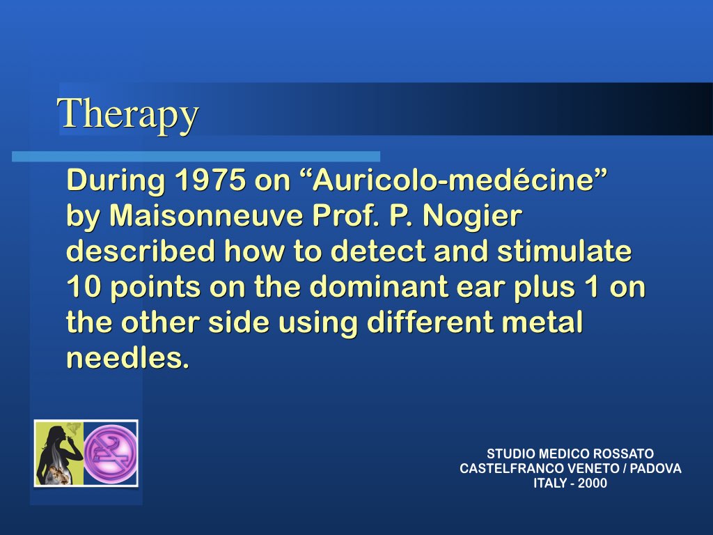 Il sistema usato è stato scoperto dal francese Nogier nel 1974 presentato alle giornate germano-latine di agopuntura e pubblicato la prima volta nel 1975 nella rivista di Auricolo-Medicina.