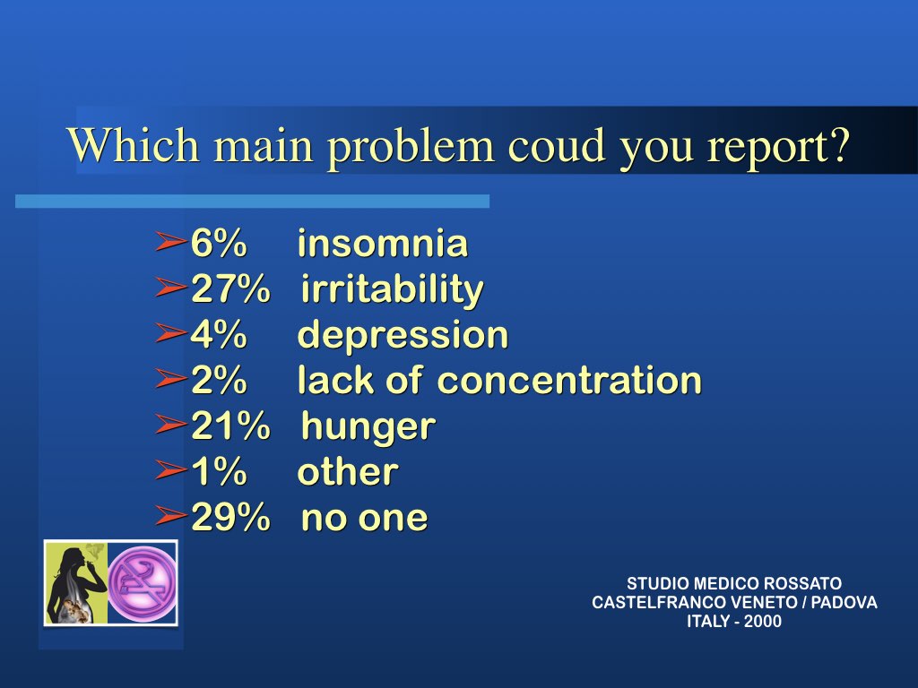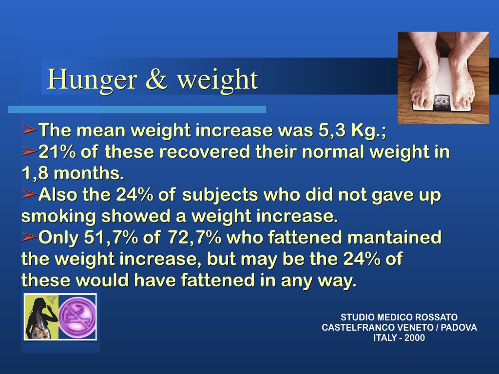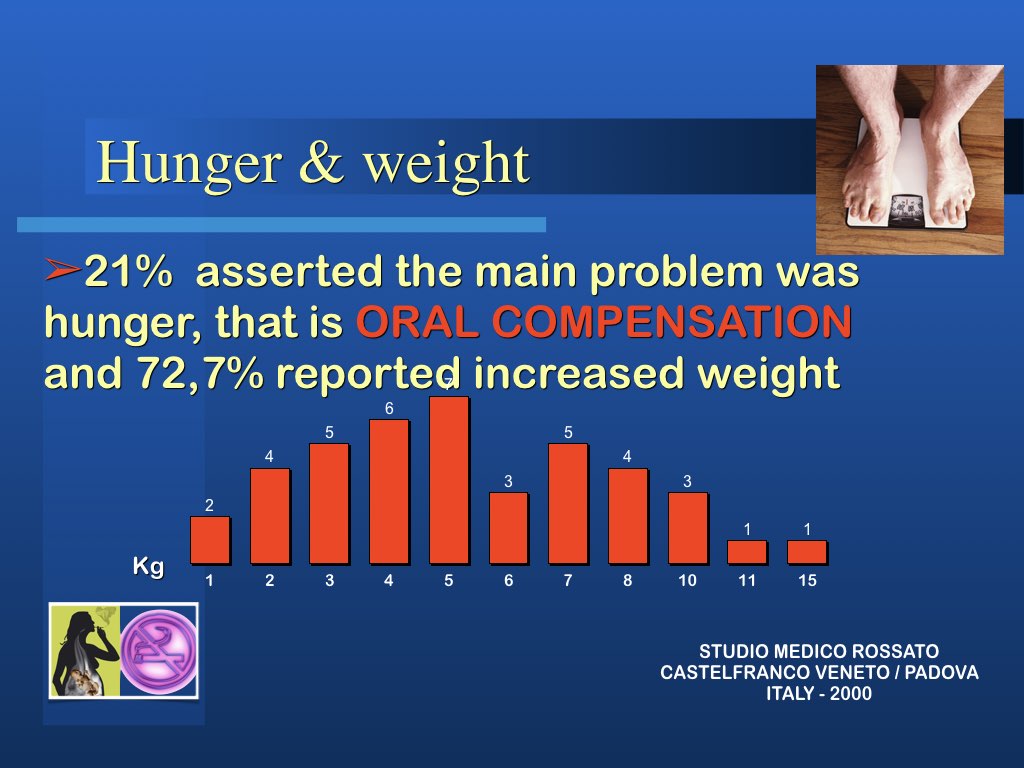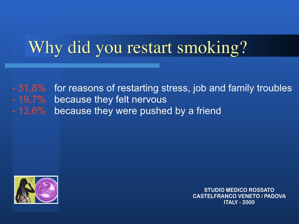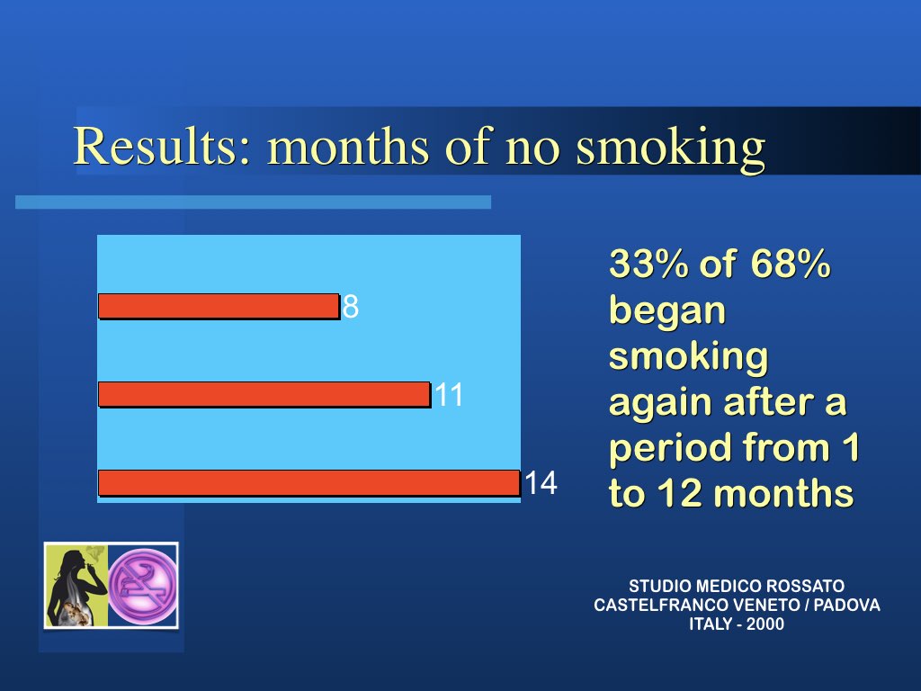 Il metodo nel suo insieme ha una percentuale di successo di circa 68%. Il recupero Per fortuna nell’organismo vi sono notevoli capacità di ripristino della funzionalità e dopo aver emesso di fumare il rischio di malattie cardiovascolari e polmonari ritorna in 5 anni quasi alla norma. Il rischio di malattia neoplastica di minuisce con il tempo ma è inversamente proporzionale alla quantità di sigarette ed al numero di anni che si è fumato.