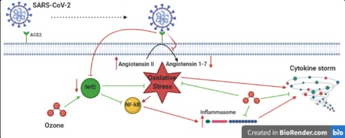 La proteina Spike e i recettori cellulari dell’enzima di conversione dell’angiotensina 2 (ACE2) sono stati identificati come recettori putativi per SARSCoV-2; potrebbero promuovere la proliferazione di COVID-19. È noto che questi recettori possono essere bloccati con alcuni monoclonali specifici ma anche attraverso il controllo di Nrf2 che regola e blocca l’attività di Spike e ACE2. Poiché l’O2O3 agisce direttamente su Nrf2, stimolandoli, sembra molto probabile che questo sia il meccanismo fisiologico più importante per bloccare la duplicazione endogena di COVID-19 prevenendo il contatto con i recettori presunti di SARS-CoV-19.