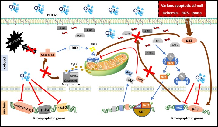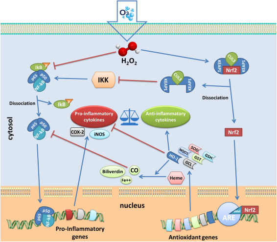 I LOP creati dopo l’esposizione all’O3 includono radicali lipoperossilici, idroperossidi, malonildialdeide, isoprostani, ozonide e alchenali e 4-idrossinonenale (4-HNE). Lo stress ossidativo moderato causato da O3 aumenta l’attivazione del fattore trascrizionale che media il fattore 2 correlato al fattore nucleare-eritroide 2 (Nrf2). Il dominio di Nrf2 è responsabile dell’attivazione della trascrizione degli elementi di risposta antiossidante (ARE). Dopo l’induzione della trascrizione ARE, un assortimento di enzimi antiossidanti ottiene livelli di concentrazione aumentati in risposta allo stress ossidativo transitorio dell’O3. Gli antiossidanti creati includono, ma non sono limitati a, superossido dismutasi (SOD), glutatione perossidasi (GPx), glutatione S-transferasi (GST), catalasi (CAT), eme ossigenasi-1 (HO-1), NADPHchinone-ossidoreduttasi ( NQO-1), Heat Shock Proteins (HSP) ed enzimi di fase II del metabolismo dei farmaci. Molti di questi enzimi agiscono come spazzini di radicali liberi clinicamente rilevanti per un’ampia varietà di malattie.