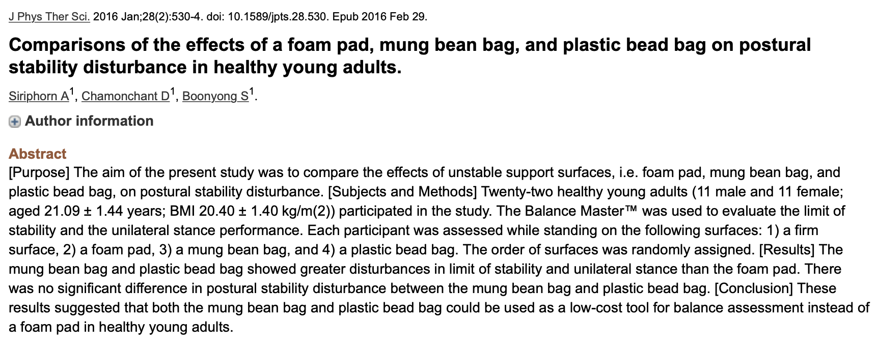 Non c’era alcuna differenza significativa nel disturbo di stabilità posturale tra il sacchetto di fagioli verdi e il sacchetto di perle di plastica.