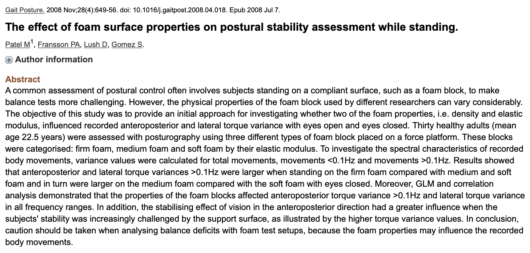 Una valutazione comune del controllo posturale coinvolge spesso soggetti in piedi su una superficie conforme, come un blocco di schiuma, per rendere più difficili i test di equilibrio. Tuttavia, le proprietà fisiche del blocco di schiuma utilizzato da diversi ricercatori possono variare considerevolmente. L’obiettivo di questo studio era fornire un approccio iniziale per studiare se due delle proprietà della schiuma, ovvero la densità e il modulo elastico, influenzassero la varianza della coppia antero-posteriore e laterale registrata con gli occhi aperti e gli occhi chiusi.