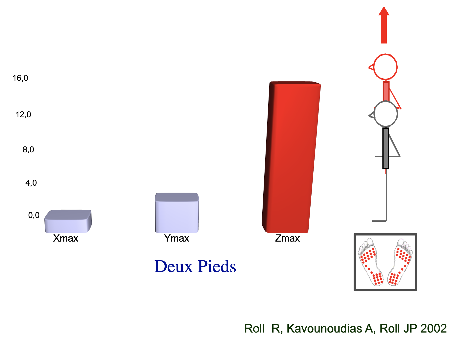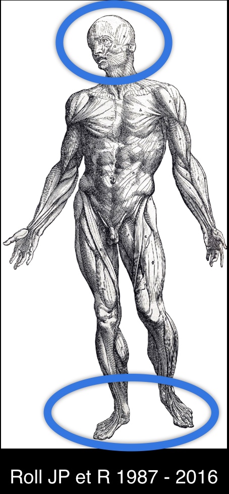 L’attività di ricerca del caro amico scomparso, prof JP Roll ha dimostrato che la zona centrale, priva di recettori per i riflessi miotattici, crea su un punto particolare di agopuntura, detto punto dell’ostetrica, perché è la presa del bambino alla nascita, che stimolato con il pollice, fa fare il primo respiro della vita, o anche punto di rianimazione 1 di Rene, dimostra che la stimolazione di questa “area” porta una risposta riflessa – antigravitaria – quindi verso l’asse Z, azimutale, verso l’alto, che srotola le torsioni della colonna vertebrale e del corpo.